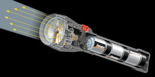 The 3610 uses a 1 watt LED that's aimed backwards into the reflector. 100% of the light is captured and aimed forward as a tight collimated beam that's as bright as an incandescent. The body is made of tough ABS resin that's corrosion proof and resistant to extreme temperatures. It is powered by 4 AA alkaline cells (included).