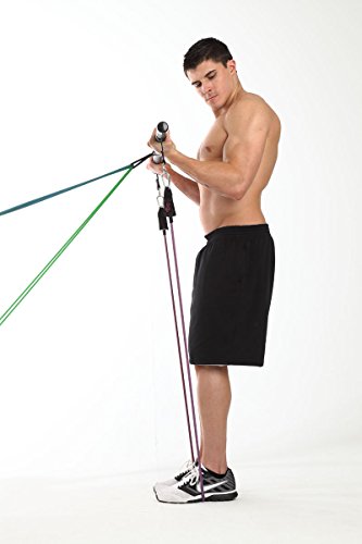 - Replicate gym and barbell exercises at home with resistance bands: bicep curls, tricep curls, standing chest presses, military presses, squats, and more