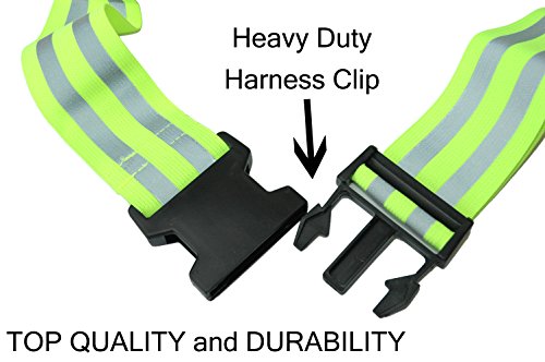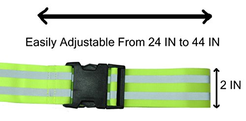 - COMFORT and PORTABILITY-Easily adjustable reflective harness strips bands are very comfortable and light weight. Easy to take with you anywhere you go. They fit wide range of sizes and body types. It adjusts adjust from 24 IN to 44 IN.