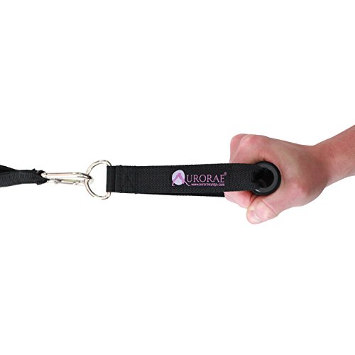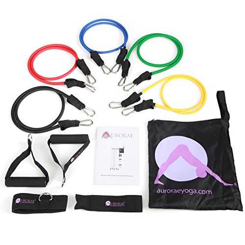 Aurorae Fitness Resistance Bands Set / Exercise Bands Set: Complete with Padded Handles, Door Anchor, Ankle Strap, Guide Book, and Carrying Case. Great for Yoga, Pilates, Cross fit, P90X. Full 2 Year Warranty. Resistance Bands Manufactured from highly durable latex which can withstand repetitive stress during workouts. Resistance Bands are great for stretching and strengthening muscles for many workouts. Resistance bands have specialized foam handles that provide extra comfort during a workout with resistance bands. Complete set includes 5 exercise bands of increasing resistance, 2 foam padded handles, 1 door anchor, 1 ankle strap, and 1 guidebook. Specially designed door anchor is reinforced to withstand forces applied during use with resistance bands. Resistance band set easily fits in the included, zippered carrying bag, perfect for on-the-go! Use them when traveling, at the gym, in the office, or even working out at home. Great for hotel room workouts Combine multiple resistance bands by using the high-quality metal D-rings to provide varying levels of resistance for a customized workout. Level of Resistance Bands: • Yellow= 2-4 pounds • Blue= 4-6 pounds • Green= 10-12 pounds • Black= 15-20 pounds • Red= 25-30 pounds *** CUSTOMER SERVICE We at Aurorae are here to serve you as best as possible! We value 5 star service so if for any reason you are unsatisfied with your resistance bands set please contact us through Amazon. We are committed to do whatever possible to resolve any issues with your resistance bands and guarantee your satisfaction.