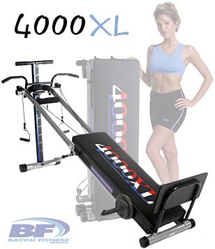 Bayou Fitness Total Trainer 4000-XL Home Gym Introducing the Bayou Total Trainer 4000-XL with its striking patriotic red, white and blue logo on the cushion. The 4000-XL has a 385 pound user capacity with 11 levels of resistance. Unlike anything before, the new Super Tuff Roller System (TPU-90-AE) delivers an exceptionally smooth ride that is unparalleled to any unit on the market today. Each Total Trainer comes with exercise cards that allow you to personalize and track your training program. You select the programs that meet your needs ...from the Warm-up/Cool Down Program to the Total Body Circuit Program. To reach your optimum health and fitness level, strength training is a definite must. Strength training is exercising with resistance. The Total Trainer utilizes your body weight for resistance, eliminating the need for heavy weights. You can adjust the percentage of your body weight lifted by moving the incline up or down. This gives you safe and effective results. If you want to lose fat and slow down the aging process, you must strength train to add muscle, burn calories, and to look and feel young again. In short, you need Total Trainer. TOE BAR INCLUDED: Included with the 4000-XL is our new Pilates Toe Bar. The Pilates Toe Bar can truly revolutionize your workout by giving you a full-range of strength, aerobic and Pilates exercises. a) Fully Assembled b) 11 Levels of Resistance c) 14" x 46" Glide Board d) Super Tuff (TPU-90-AE) Rollers e) 3 & 4 Point Pulley System Deluxe Double Stitched Box Cushion f) Strength Training Attachments and Accessories Include: Toe Bar, Bicep Curl Press Bar, Power Weight Bar for Adding Free Weights, Pull-up / Push-up Bar, Sit-up Cuff Strap, Heavy Duty Squat Board, Independent Twin Handles, and Dual Leg Cuffs g) Four Program Cards, Instructional Manual and DVD h) Oversized Castors for Easy Transport i) Folds and Rolls for Easy Storage j) Folded Footprint - 20" x 14" x 50" in Height k) Open Footprint - 20" x 94" x 48" in Height l) 385 Pound User Capacity m) Maximum User Height 6' 7" n) Shipping Weight - 106 Pounds o) 1 Year NO HASSLE Parts Warranty