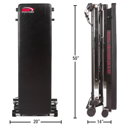 Bayou Fitness Total Trainer DLX-III Home Gym To reach your optimum health and fitness level, strength training is a definite must. Strength training is exercising with resistance. The Total Trainer utilizes your body weight for resistance, eliminating the need for heavy weights. You can adjust the percentage of your body weight lifted by moving the incline up or down. This gives you safe and effective results. If you want to lose fat and slow down the aging process, you must strength train to add muscle, burn calories, and to look and feel young again. In short, you need Total Trainer. This top-notch home gym has a commanding presence. Attention was given to details such as chrome plating the rails and many attachments. You will notice the fine workmanship on the cushion accented with an embroidered logo. This attention to detail sets the Chrome Total-Trainer DLX-III apart from all other home gyms. The DLX-III has an extra-large squat board, upgraded pull-up push-up bar, upgraded twin handles and an additional attachment, the Bayou Bicep Power Flex. Each Total Trainer comes with exercise cards that allow you to personalize and track your training program. You select the programs that meet your needs ... from the Warm-up/Cool Down Program to the Total Body Circuit Program. The DLX III has 11 levels of resistance and a user capacity of 400 pounds. It gives you the convenience of having a multi station gym in your home. It is shipped double boxed and has a shipping weight of 108 pounds. a) Fully Assembled b) 11 Levels of Resistance c) 14" x 46" Glide Board d) Ball Bearing Rollers e) Embroidered Logo f) Deluxe 2" Double Stitched Box Cushion g) Strength Training Attachments and Accessories Include: Pro AB Crunch Strap, Pilates Toe Bar, Bicep Power Flex, Bicep Curl Press Bar, Power Weight Bar for Adding Free Weights, Chrome Pull-up Push-up Bar, Sit-up Cuff Strap, Extra Large Heavy Duty Squat Board, Chrome Independent Twin Handles, and a Dual Leg Cuff Assembly h) 3 & 4 Point Pulley System i) Dual Side Glide Board Pulleys j) Four Program Cards, Instructional Manual and Guide k) Folds and Rolls for Easy Storage l) Training Video m) 400 lb. User Weight Capacity n) Maximum User Height 6' 7" o) Folded Footprint - 20" x 14" x 50" p) Open Footprint - 20" x 94" x 48" q) Shipping Weight - 108 lbs. r) 1 Year NO HASSLE Parts Warranty