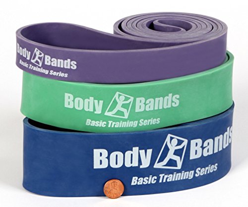 Body Bands CrossFit Resistance Band Pull Band Assist Band Set 4 is the ideal set for Cross Training or for Adults over 225 lbs for us as Pull Up Assistance Bands. This is also a great set for more advanced Resistance Band Training Exercises. This resistance band set includes 3 Bands: the Purple (1 1/8""), Green (1 3/4"), & Blue (2 1/2") Bands. Each band is a 41" Continuous Loop Band and offers a resistance range based the size scale below. Body-Bands are ideal for a home gym or to add resistance training to any workout routine. Body Bands are great for: * P90 / CrossFit / or any Cross Training Program * Pilates and Yoga for Strength and Flexibility * Personal Trainers and Fitness Instructors * Business travelers or anyone on the go * Athletes through any fitness level * A Simple, Fast, and Effective Workout Loop Band Resistance Levels: * 1/4" | Lt. Orange | 5 to 15 Pounds of Resistance * 1/2" | Red | 10 to 35 Pounds of Resistance * 3/4" | Black | 30 to 50 Pounds of Resistance * 1 1/8" | Purple | 40 to 80 Pounds of Resistance * 1 3/4" | Green | 50 to 120 Pounds of Resistance * 2 1/2" | Blue | 60 to 150 Pounds of Resistance * #3 1/4" | Orange | 70 to 180 Pounds of Resistance Why Body-Bands? Body-Bands offers you great high quality products at a very competitive price. Including a 30-Day Money Back Guaranty and a 1-year warranty! Why Resistance Band Training? Resistance Band training requires coordination and balance so you end up using more of your core muscle groups to stabilize your body. With Resistance Bands, you can target specific muscle groups or smaller muscles more easily than with weight training.