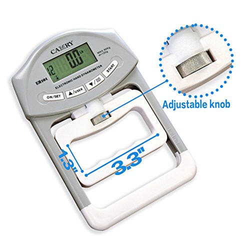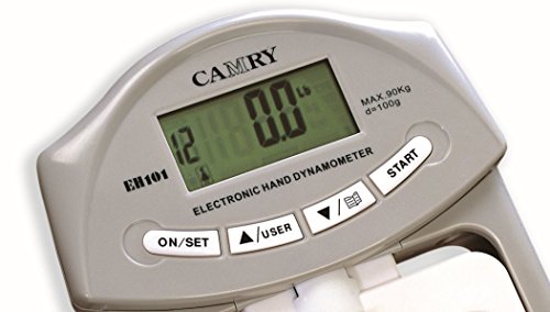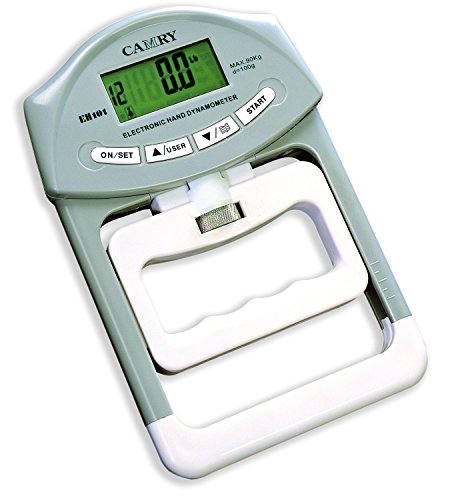 OverviewThe Camry digital hand dynamometer is engineered as a professional training device for handgrip strengths suitable for any doctor's office, physical therapy clinic, engineering lab, or the gym.-Adjustable center knob allows the device to be adjusted for different hand sizes and preferences.-19 definable users with options for gender and age to store, along with the ability to save and recall test results for each user. Compares individual test run for each of the 19 users, and displays the incremental increase, or decrease from the last record.Each test run is rated "weak", "normal", or "strong" based on age and gender data entered for each user.-Easy switch from lbs. to kg. at any time, including for last recorded data. How to Use 1. Remove the isolation tag from the battery case;2. Press (ON/SET) button to turns on; 3. The middle two buttons (ARROWS up/down) allow you to select a different user. Then press (ON/SET) button to cycle between gender and age of the selected user, and edit the values using the arrows.4. When you are ready you can hit the (START) button to test your handgrip.5. Now if you press (ON/SET) button, it converts between LB / KG.6. While squeezing, it shows the amount of force you are currently squeezing, as soon as you let go it shows you the max/peak of what you squeezed. 7. Press the (ARROW down) button if you want to save the result, or hit (START) button to retest.8. After you test your grip, and the max result is displayed, if you wait 6 seconds it will then tell you how many lbs/kgs more/less you've done in comparison to your saved result. WarrantyEvery hand dynamometer is individually hand tested for defects and accuracy before it leaves the factory.We offer 5-year product warranty.