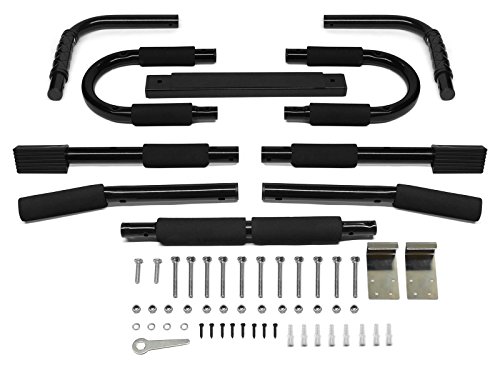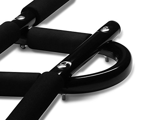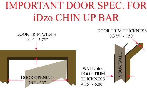 The best in class, fully functional, all-in-one pull up, chin up bar on the market today. IDzo CXP bar are great for developing back, chest, and arm muscles, particularly biceps and forearms. This portable, multi-function chin up bar is an easy and inexpensive way to tone up your muscles and get that athletic you always wanted. Packed with this bar is a 45-lb X-Safe Resistance Band set that helps to replace the dumbbells. You can have any combination from 0 - 45 lbs from this band set. Bar's door requirements: Door requirement: 28 - 33" opening. Door thickness: 4.75" - 6.25" thick including door trim. Door trim: 0.375 - 1.50" trim thickness; 1.00" - 3.75" trim width (see illustrated picture) with flat surface on the upper end to support the chin up bar Door structure must be able to support up user weight & movements. Optional wall brackets included for your convenience. (Not required) Resistance Band includes, 1 of 10 lbs (yellow), 1 of 15 lbs (blue), and 1 of 20 lbs (red) of X-Safe Bands