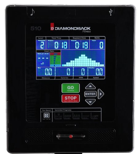 The Diamondback 510UB provides the upright comfort of a beach cruiser with the fitness benefits of a spinning class. The Diamondback 510UB is equipped for anyone with its 300 pound weight capacity, multi-position handlebars and calibrated heartrate sensors, allowing you to monitor your pulse for maximum cardiovascular effectiveness. With Diamondback's standard, steel-crafted components and 14 pound magnetic flywheel, the Diamondback 510UB is the upright bike that's built to last, and with a frictionless eddy current braking system, the 510UB delivers a smooth, quiet and durable ride. With 16 increments of resistance, the Diamondback 510UB allows you to gradually increase your fitness intensity, and with 20 workout programs you're sure to find the pace that's right for you. Watch your calories burn away with real-time feedback on Diamondback's brilliant blue LCD electronic display or tilt the panel down to watch your home television without straining your neck. The integrated, multi-speed fan helps keep you cool and the fold out tablet rack gives you the ability to browse your favorite media while you work out. The Diamondback 510UB's footprint is designed to fit your home with the space-conservative dimensions of 58'' H x 41'' W x 23'' D. Warranty includes: limited lifetime on frame and brake, 3 years on parts, 1 year on labor, 90 days on wear items.
