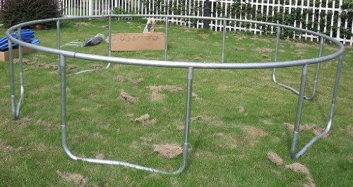 Exacme trampolines are made with strong, rust-resistant galvanized steel tubing, which is safer and longer-lasting than conventional welded trampolines. 6 U-shaped legs with 12 balanced contact points add stability and prevent wobbling or tipping, also add more weight capability. Galvanized Springs provide a deeper, more exciting bounce. This 15-foot, 108-spring trampoline has a 375-pound maximum weight capacity, is easy to assemble and requires no tools or extra drilling, and meet all ASTM, TUV, and GS quality and safety requirements. A zipper enclosure allows easy in-and-out, the rust-resistant frame will hold up to years of heavy outdoor use. Details: Trampoline: Rust Resistant Galvanized Steel Heavy Duty Frame; 6 of U-Shape legs; PP Jumping material ; Jumping material Diameter:159 inch; Hot deep galvanized Frame steel ; 6 pieces of U-shape steel tube (hot deep galvanized) ; 12 pieces of Leg extension tube (hot deep galvanized) ; 108 pieces of 7" Galvanized Springs ; PE+PVC pad cover in blue color. Net Enclosure: Creates a Fun Jumping Environment without limiting Visibility; PE mesh netting; Rust-resistant galvanized steel frame padded with protecting foam for the poles ; All materials are made with durable UV protected material for increased weather resistance; Sturdy straps and ropes to secure net to trampoline ; Trampoline height 3.1ft, height with net 9ft; Maximum Weight Capacity: 375 lbs. Package weight 180 lbs with 3 boxes. Including:15ft trampoline, net enclosure, Poles , ladder, Clamps, Pole pads, tools and hardware .