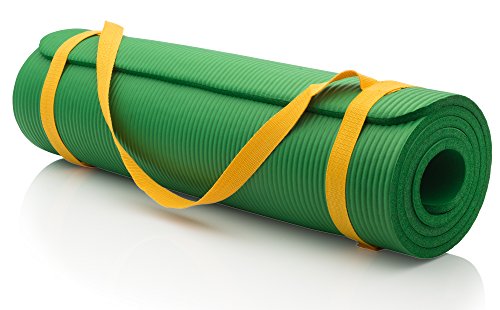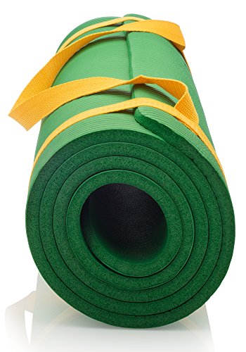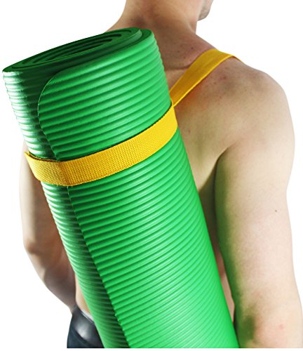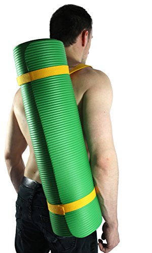 Super comfortable, double sided non slip exercise yoga mat Our gorgeous mat measures 71 inches in length, 24 inches in width and is almost 1/2 thick, for complete comfort. Our Exercise Yoga mat comes with not only a carry bag, but also includes beautiful yellow carry straps which you can strap around your shoulder for convenience and comfort. We only offer a green colored yoga mat because for years green has been a color most associated with balance, positive energy, growth, renewal, healing and life essence which is what yoga is all about. Our beautiful green mat will give you calmness and more focus during your exercise or yoga sessions. Our premium Exercise Yoga Mat is easy on your back, provides comfort for your knees and its non slip surface grips the floor for maximal stability and comfort.