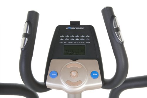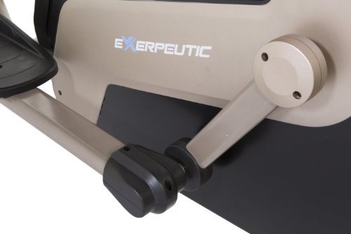 Exerpeutic 5000 Magnetic Elliptical Trainer with Double Transmission Drive/Bluetooth Technology/Mobile Application Tracking Exerpeutic 5000 “Mobile App Tracking” Elliptical Trainer The EXERPEUTIC 5000 “Mobile App Tracking” Magnetic Elliptical Trainer can handle up to a 270 lb user weight capacity. Mobile App Tracking which is Bluetooth enabled and compatible with Apple (iPhones and iPads) and Android system smart phones and tablets, will allow you to track your workouts and at the same time watch a movie, read a book, check your email while exercising in the comfort of your own home. A programmable computer, Double Transmission Drive System, 24 level magnetic tension resistance via computer control, and hand pulse sensors for targeting heart rate zones, are all high end features included on the Exerpeutic 5000 Elliptical at a very affordable price. Double Transmission Double Transmission utilizes a Space Saver compact design that reduces the overall length and size of the elliptical trainer. Product Set Up Dimensions Dimensions: 55 inch L x 25 inch W x 64 inch H. Weight: 84 lbs. Warranty: 1 year limited. Smooth Elliptical StrideView larger Smooth Elliptical Stride An 18 inch smooth elliptical stride length provides a comfortable and full range work out, without any strain on the knees or ankles. Dual Action HandlebarsView larger Dual Action Handlebars Dual action handlebars provide a complete upper body workout. ComputerView larger Computer A 12 Workout Programmable Computer with time, distance, RPM, Watts, Heart Rate Control and 4 individual settings. 3 Piece Cranking SystemView larger 3 Piece Cranking System A strong and durable 3 piece cranking system for high end performance and continuous momentum. Mobile App TrackingView larger Mobile App Tracking via Bluetooth With built in Bluetooth, Mobile App Tracking allows you to track your workout results anywhere and at any time. Just download the free Exerpeutic App to get started. Transportation WheelsView larger Transportation Wheels Built-in transportation wheels for easy relocation.