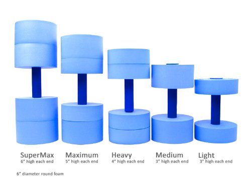 We designed our ExervoTM aqua fitness pool dumbbells with a tight focus on overall component quality. Our high density, AquaComfortTM EVA foam is the ideal material for indoor or outdoor pool and open water exercise. EVA foam is UV resistant and is very pliable so it does not chip or become brittle. This foam is very dense so water beads up and the smooth finish makes them easy to clean. The AquaComfortTM foam is resistant to harboring bacteria like the typical open cell white foam. ExervoTM pool dumbbells are designed for comfort and performance. This max resistance pair of dumbbells features 5" thick by 6" round foam on each end. This product is not returnable once it has been used in the water. The resistance of any foam dumbbell moving through water will change slightly or even dramatically depending on the shape of the dumbbell and it's orientation, path and speed. Another factor is whether the dumbbell is moving towards or away from the surface since the natural buoyancy of the foam will reduce the resistance if it is moving towards the surface of the water.
