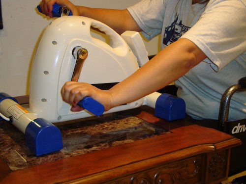 The Z-40 Arm and Leg Machine, is a powered arm- or leg-propelled bicycle exerciser designed for use by people with spinal cord injury or upper or lower extremity disabilities. This portable , lightweight cycle can be used on a tabletop or floor. The unit features an accessible control panel and cabled remote for ease of operation, The Cycle allows you to exercise your legs while watching TV, or just relaxing in a chair It also can be used on a desk or table, for arm and shoulder exercises. It comes per-assembled and is ready to use out of the box.The Cycle is motor driven, with adjustable speed and an overload protection feature. The Cycle can also be used without the motor for greater resistance. It comes with a LCD display that reads out distance, time, calories and speed. The cycle also has built in carry handles for easy relocation. It is a low impact workout, easy on the joints. Exercising using the Cycle promotes blood circulation, improves balance, and strengthens muscles.