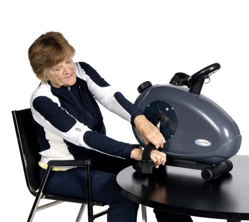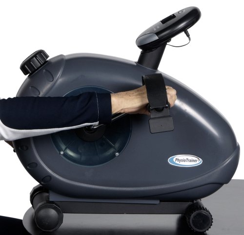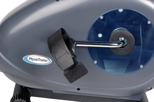 This PhysioTrainer from HCI Fitness offers heavy-duty construction and unique design for any clinic or home setting. Designed to use with a table top for upper body training or on the floor as a leg exerciser, this trainer features a fully welded steel frame, industrial rust-resistant paint, and a crack-resistant commercial grade shroud. An easy-to-read display is self-powered and offers a tilt feature that allows the user to clearly see the readouts. This display shows your current speed (mph or kph), distance, calories burned, elapsed time, and scan mode. Key Display Features: Tilting, oversized LCD display Elapsed time Current speed (mph or kph) Distance Scan mode Calories burned Additional Features: Large, easy-to-adjust resistance knob with 8 loading levels Whisper quiet electromagnetic resistance Commercial grade, high-impact shroud cover Industrial poly V belt drive for smooth and dependable pedaling Comfortable multi-purpose handles with adjustable Velcro straps Compact design that's easy to store when not being used