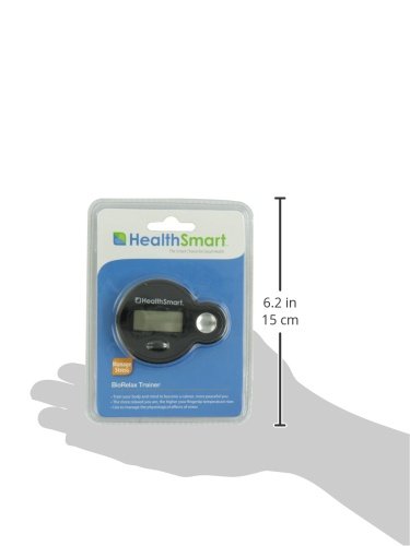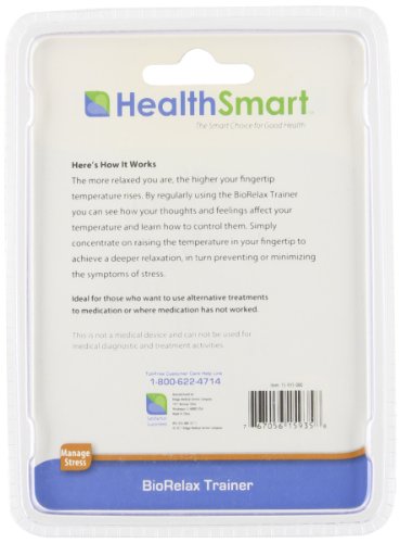 HealthSmart Wireless Biofeedback Device, Relaxation Technique for Stress Relief Take charge of your health by learning to reduce your stress levels. The more relaxed you are, the higher your fingertip temperature rises. By regularly using the HealthSmart BioRelax Trainer, you can see how your thoughts and feelings affect your temperature and learn how to control them. Simply concentrate on raising the temperature in your fingertip to achieve a deeper relaxation, preventing or minimizing the symptoms of stress. Ideal for those who want to use alternative treatments to medication or where medication has not worked. How the BioRelax Trainer Helps You RelaxWhen your body is feeling stressed, it goes into survival mode by directing your blood flow toward your vital organs and away from your extremities. This causes your hands and feet to decrease in temperature. When your body is relaxed, it releases chemicals that increase blood flow to your skin’s surface resulting in an increase of body temperature. By regularly using the HealthSmart BioRelax Trainer, you can see how your thoughts and feelings affect your temperature and learn how to control them. Simply concentrate on raising the temperature in your fingertip to achieve a deeper relaxation, preventing or minimizing the symptoms of stress. Studies Show Biofeedback Can Reduce MigrainesThermal biofeedback has been shown to help reduce the occurrence of migraine headaches. The results of several studies show changes in the blood flow in the brain during migraine attacks and in the pain-free periods in between. Using biofeedback training, a person can influence the blood flow to the brain and better manage a headache. Most studies on biofeedback indicate that it reduces the frequency and duration of headaches, both in children and adults. (Source: Webmd.com). How to UseIt’s best to use the BioRelax Trainer in a comfortable chair in a quiet place. Keep your spine straight with your hands in your lap. Remove any distractions. In order to develop a calming habit, try to practice the same time each day. Hold your thumb next to the trainer and wait till your temperature reads. Close your eyes and focus on relaxing your body. Your temperature will begin to rise. The higher it rises, the more relaxed you are. After each ten sessions, change your location to a more active setting. Note: this is not a medical device and cannot be used for medical diagnostic and treatment activities. Features Take charge of your health by learning to reduce your own stress level.  This small, affordable device can help you train your body and mind to be calmer and more peaceful. The more relaxed you are, the higher your fingertip temperature rises. It can help to reduce the physiological results of stress such as migraines or other stress-related ailments. This simple and natural relaxation technique produces no harmful side effects and requires no wires. Ideal for those who want to use alternative treatments to medication or where medication has not worked. Fahrenheit or Celsius switchable Auto shut off in 10 minutes 3 x 2 ¼ x ½ inches; includes LR44 battery