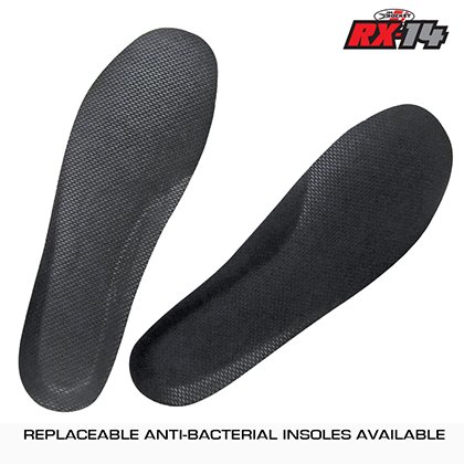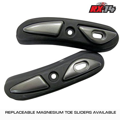 Replaceable magnesium tor sliders Antibacterial replaceable insoles Combined velcro and zipper enclosure reinforced by a ratchet strap for ultra secure fit Reinforced gear shift area