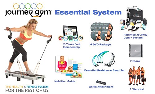 journey gym Features: 30 resistance bands (five on each side plus ten additional bands) for a customizable resistance system of 5 to 75 pounds per side, adjustable handles, and legs to adjust the height of the gym and convert it to a stair stepper.Bring the gym with you each time you hit the road with the portable Journey Gym. The world's first truly portable universal gym, the Journey Gym literally goes everywhere you do. The journey gym ESSENTIAL package has everything you need to start your health journey right and then some. It is designed to enable you to start and then continue your journey by integrating additional bands that allow you to customize resistance levels in your journey gym portable universal gym, intermediate-level DVD workouts, and an ankle attachment for leg strengthening. Like the CORE package, with the ESSENTIAL home gym package you get the basic building blocks leading to better health, allowing you to get fit, track your progress, learn to eat sensibly and communicate your success to others. Never worked out before? No worries! The ESSENTIAL package features our Gradually Ramping Interval Training Programs (G.R.I.T.), a series of high-intensity, interval training workouts with a twist: We begin at the level that is right for you and increase the intensity from there. We've designed G.R.I.T. to fit your life and your life style. Want to meet other Journey Gym users? Visit the free online community www.journeygym.com, where you can create exercise videos, track your activity and nutrition, and share your progress with friends and family.