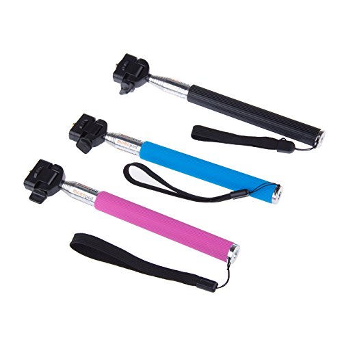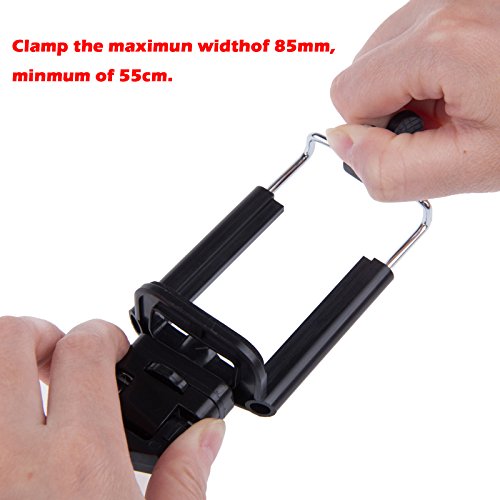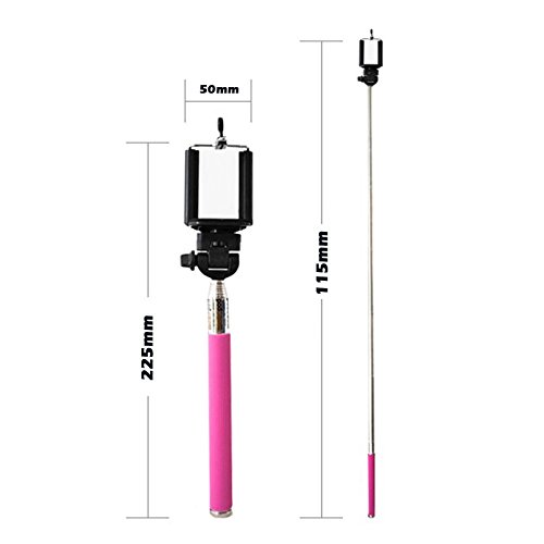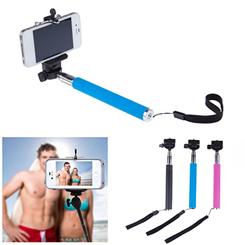 Description: 7-segment digital camera monopod telescoping wand stick, let you take those photos that can not reached with your hands; It is Self-timer artifact, portable and lightweight and easy to carry, Polyurethane lined grip designed and keep your phone safety safe and secure! Specifications: Material: Aluminum+ Polyurethane+ plastic Stretch Length:22cm-108.5cm,7-segment length adjustable Cameras interface: Universal 1/4 screw Phone holder part, fit phones 5-8cm width Net Weight:143g, Shipping weight: 160g Color: Black , Blue, Hot pink three colors for you choose Contains key ring and rope to prevent from falling Perfect for: Traveling, video diaries, hiking/camping, weddings, parties, the beach, concerts, Aerial photos, sports events etc. Compatible with: 1/4" screw camera Applies to almost all mobile phones Apple iPhone 3G 3GS 4 4S 5 5s 5C Samsung Galaxy S S2 S3 S4 HTC Motorola LG SONY etc. Package includes: 1x Extendable Self timer Handheld Monopod 1x Phone clip NOTE: It doesn't have button to take photo, you have to set phone to voice or timed.