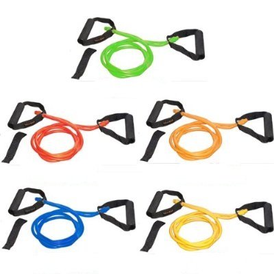 - Twin tube band 5 -level bands: blue (5-10 lbs), yellow (10-15lbs), red (15-20lbs), orange (20-25 lbs) and green (25-30 lbs). Comes with heavy-duty handles. 5 door anchors, seperate carry bag.