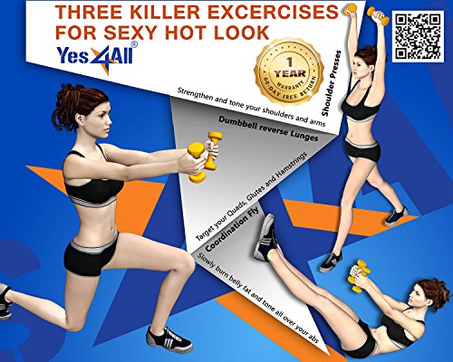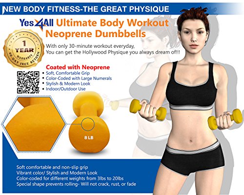 PRODUCT BENEFITS: Yes4All are made of cast iron and are coated with Neoprene for comfortable and slip free grip. Now you can experience the greatest comfort since these dumbbels are grippy and gentle on hands so you don't to wear gloves. The special-shaped design helps protect you and the floor in case of drops. Plus, hexegon design prevents it from rolling on the floor when put away. Stylish vibrant, color coded weight and clear numbers LBS on make it easy and quick to pick up the right dumbbells for daily routine workouts. Great for indoor and outdoor use. High quality Neoprene coating will not crack, rust or fade. Compact size is perfect for home, commercial gyms and travel. Easy to clean and store away when are not in use. SELECT THE APPROPRIATE WEIGHTS: Heavy dumbbells are perfect for building massive muscle in arms and shoulders, stability and core strength. Lighter dumbbels are nice additions to add resistance to squats and lunges, and aerobic workouts and many more. Warning: Yes4All is a registered trademark. If you're listing a non-Yes4All item for sales against the page, you are violating 1. Amazon listing policy 2. Fair competition laws 3. Yes4All trademarks for misleading the use of its logo and name Yes4All reserves the right seek damages including attorney fees from any such person or business to the fullest extent permitted by law.