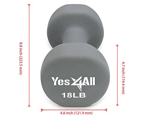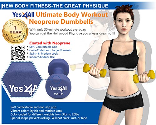 PRODUCT BENEFITS: Yes4All are made of cast iron and are coated with Neoprene for comfortable and slip free grip. Now you can experience the greatest comfort since these dumbbels are grippy and gentle on hands so you don't to wear gloves. The special-shaped design helps protect you and the floor in case of drops. Plus, hexegon design prevents it from rolling on the floor when put away. Stylish vibrant, color coded weight and clear numbers LBS on make it easy and quick to pick up the right dumbbells for daily routine workouts. Great for indoor and outdoor use. High quality Neoprene coating will not crack, rust or fade. Compact size is perfect for home, commercial gyms and travel. Easy to clean and store away when are not in use. SELECT THE APPROPRIATE WEIGHTS: Heavy dumbbells are perfect for building massive muscle in arms and shoulders, stability and core strength. Lighter dumbbels are nice additions to add resistance to squats and lunges, and aerobic workouts and many more. Warning: Yes4All is a registered trademark. If you're listing a non-Yes4All item for sales against the page, you are violating 1. Amazon listing policy 2. Fair competition laws 3. Yes4All trademarks for misleading the use of its logo and name Yes4All reserves the right seek damages including attorney fees from any such person or business to the fullest extent permitted by law.