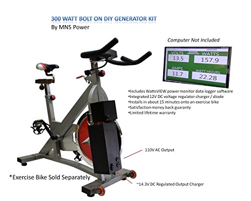 MNS Power 300 Watt Stationary Bike Power Generator Bolt On Kit Features - MNS Power provides a satisfaction guarantee or your money back, Limited Life Time Warranty (See description for details). - IVRC Technology (Integrated Voltage Regulator & 12V Battery Charging capability (Set to ~14.3V DC) - Integrated WattsVIEW power monitoring software capability allows your computer to show realtime Voltage, Amps, Watts, Watt Hour graphs. Records your data to your hard drive during your workout. - Typical power output: 0.1 to 0.3 kWH during a one hour work out - Peach of mind power on demand - power when you want it, any time, any place - Charges cell phones, laptops, 12V lead acid batteries - Provides power to your laptop computer, television flat screen , LED lights (Items that require less than 50 Watts are fairly easy for an adult to power) MNS Power brings you the SPG-300W power generator bolt on kit for square frame spin bike systems. This is JUST THE BOLT ON KIT. You will need to spend $250 and purchase your own Indoor Cycling Bike from Amazon (Easily found on Amazon by searching for product B002CVU2HG Sunny Health & Fitness Pro Indoor Cycling Bike ) . This system is more efficient than the belt drive system and the roller system because it has less friction between the roller and the wheel. MAINTENANCE The rubber roller on the generator shift needs occasional adjustment to maintain proper contact on the fly wheel. If the roller sees heavy usage at power levels over 200 Watts, the roller may need to be replaced after 1000 hours of riding. LIMITED LIFETIME WARRANTY Covered under the lifetime warranty: All electrical components and mechanical enclosure Not covered under the lifetime warranty: Labor to repair system, shipping costs for repairs, generator rubber roller