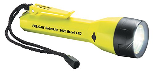 Pelican 2020B SabreLite Recoil LED Flashlight. Similar to the SabreLite 2010 LED Flashlight but with a voltage regulated LED that extends peak brightness. Recoil LED Technology results in a true collimated beam that cuts through thick smoke, fog, and dust. It is powered by 3 C alkaline cells. Built Pelican tough Unconditional Lifetime Guarantee of Excellence 50% Longer Battery Life 10,000 Hours of Lamp Life Recoil LED Technology: As bright as a Xenon light with the battery life of an LED. Body: ABS Resin Lens: Polycarbonate Resin Shroud: Xenon Polymer Resin Switch Type: Twist On/Off Lens Shroud Modes: On/Off Clip: ABS Resin Contact, Spring & Retainer: Stainless Steel and Brass Nickel Plate O-Ring: Ethylene Propylene.