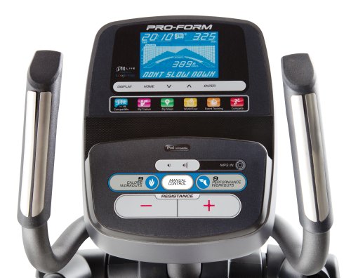510 E Ellitpical Packed with weight-loss features, the Pro-Form 510 E Elliptical will help you burn calories and reach your goals. Target your trouble spots with the Stride Adjust Incline Ramp. Five positions isolate specific muscle groups for more defined results. And, with every adjustment, your stride adjusts from 18 – 20” for a more comfortable fit. Built-in workouts target calorie-burning goals and a 5” backlit display tracks your workout progress. The ProForm 510 E Front Drive Elliptical 510 E Console Detail with 5" Backlit Display Features and Specifications: Stride Adjust Incline Ramp: Accelerate your training with target toning. With a quick adjustment, this ramp adjusts your stride up to 20” and your incline up to 20 degrees to focus on specific muscle groups. Target your glutes, quads and calves with 5 preset positions for better, more defined results. Front Drive Design: Step up to a maximum stride length and an extra smooth ride with this front drive design. The sophisticated, small footprint of the 510 E Elliptical is perfect for any space. Plus, this innovative design is easy to get on and off for quick workout access. 5" Backlit Display: Perfectly clear and easy to read, displays your speed, time, distance, pulse, resistance and calories burned. 18 Digital Resistance Levels: Increase calorie burn and workout intensity with 18 digital resistance levels. A quick adjustment quickly personalizes your workout and, with SMR Silent Magnetic Resistance, every adjustment is smooth and natural for a comfortable workout. Upper-Body Workout Arms with Soft Grips: Burn more calories and add muscle tone with the upper-body workout arms that provide a great total-body workout and increased cardio benefits. 18 Built-In Workout Apps: Get the workout you want with 18 built-in workout apps. Workouts are designed by a Certified Personal Trainer and automatically adjust the resistance of the elliptical to maximize your time for faster results. Inertia-Enhanced Flywheel: Get a smoother, more comfortable workout with the heavy-duty, inertia-enhanced flywheel. A faster gear ratio and effective weight placement deliver a more natural striding experience. Oversized Pedals: Work out in comfort with these oversized pedals that offer a number of different foot positions. Dual-Grip EKG Heart Rate Monitor: Make the most out of every workout by monitoring your heart rate with these built-in handlebar sensors. They will ensure you are in the right training zone for your goals. Commercial-Guage, Solid Steel Construction: Built to last, this elliptical was made with commercial-gauge solid steel and has undergone rigorous testing to deliver heavy-duty, quality construction. Transport Wheels: Moving this elliptical from one place to another is fast and easy with the built-in wheels. Intermix Acoustics 2.0 Sound System: Enjoy your favorite media with this built-in sound system that produces a broad range of frequencies and rich, equalized sound. Compatible Music Port for iPod: Rock your workout to your favorite music. Water Bottle Holder: Stay hydrated throughout your workout by keeping your water bottle close. 275 lb. Weight Capacity: The ProForm 510 E Elliptical accommodates up to 275 lbs. Warranty: Lifetime Frame Warranty and 1-Year Parts & Labor. Oversized Pedals offer a number of different foot positions Adjust your Stride up to 20" and your Incline up to 20 degrees iFit Live Technology Compatible Train around the world with workouts Powered by Google Maps. Now, you can draw your favorite courses and the 510 E Elliptical automatically creates personalized workouts. And, the resistance adjusts to match the intensity of the terrain so the elliptical does what the street does! Lose weight with Jillian Michaels—America’s Toughest Trainer! Jillian’s voice coaches you through your own unique weight-loss program to help you reach your goals. Delivering progressive, 8-week training, new workouts are wirelessly and automatically downloaded every day to the 510 E Elliptical. Each workout automatically controls your resistance to maximize your results. Race for the title in weekly races with other iFit Live community members. Complete the race on your schedule and compare your time with people from around the world! And, track your nutrition and other activities on iFit.com. Training for a race, losing weight or maintaining a healthy lifestyle is easy with the online food and activity log. *Requires iFit Live wireless adapter. Wireless adapter sold separately. Front Drive Elliptical Trainers from ProForm 510 E 710 E 910 E iFit Live Compatible Yes Yes Yes Display Type 5" Backlit 5" Backlit 7 " Backlit Resistance Levels 18 20 22 Built-In Workouts 18 20 24 Workout Programs 9 Weight-Loss, 9 Performance 10 Weight-Loss, 10 Performance 24 Target Toning Workouts Stride Length Adjusatbility 18 - 20 inches 18 - 20 inches 20 - 22 inches Incline Ramp Adjustability Up to 20 degrees Up to 20 degrees -10 degree decline - 20 degree incline CoolAire Workout Fan No Yes Yes Weight Capacity 275 lbs. 300 lbs. 325 lbs. Warranty Lifetime Frame, 1 Year Parts and Labor Lifetime Frame, 1 Year Parts and Labor Lifetime Frame, 3 Year Parts and 1 Year Labor
