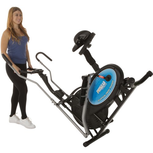 The ProGear 400LS Air Elliptical and Exercise Bike Combo is perfect for apartments or space limited areas, where space saving is a priority. It will provide a low impact upper and lower body workout using the natural elliptical motion to eliminate any stress on joints and ankles. Then, if you want to switch your workout to an exercise bike, a comfortable large adjustable seat makes the transition very simple. The combination of an elliptical and exercise bike workout will work more and different muscle groups than a singular fitness machine. So increase the value and effectiveness of your fitness machine by using the ProGear 400LS All in One. Features: 14" Stride Length with backward stride capability. 4 direction adjustable expanded extra large seat for all users. Additional weight capacity up to 250lbs. Reinforced crank system for consistent momentum. Easy dial tension adjustment for a more or less challenging workout. An easy to read computer LCD display that indicates distance, calories burned, elapsed time, speed and heart pulse. Water bottle holder included. Additional stationary arms with dual pad pulse sensors. Stationary arms provide an option to using the dual action arms. Heart pulse monitor calculates the heart rate so you can stay within your target heart rate zone. Larger pedal construction with ribbed dot design to prevent foot slippage when exercising. Transport wheels provide for easy relocation. Dual Action workout arms provide an additional upper body workout. Some assembly required. Warranty: 1 year limited. Origin: China.