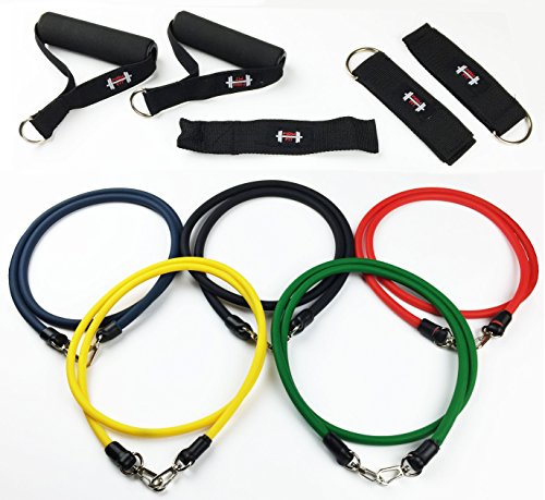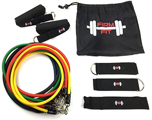Resistance Bands - Best for P90X and Crossfit type Workouts. This complete set of Exercise Bands includes Ankle Straps, Handles, Carrying Case and a Door Anchor to give you a Full Body Workout, from Shoulders to Legs - by Firm Fit