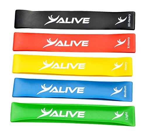 - Give your workout a boost and stretch your workouts to the max without spending a fortune on niche workout equipment or cluttering your home with endless devices. The Alive Resistance Loop Bands Set will bring the perfect amount of resistance and flexibility to your training sessions in a flash! Best of all, you don't have to pay unreasonably high gym membership costs or worry about driving across to town to go work out. These resistance bands have endless uses and offer infinite possibilities to create fat burning, strength-boosting workout. - Made from high quality, all-natural latex, this classic set includes five sizes of resistance bands in a convenient mesh carrying bag so that you can customize your workout and exercise on the go! Ranging across light, medium, heavy, x-heavy, and xx-heavy, the bands are safe for anyone to use. Children can even use these bands with parental supervision! You'll love the textured surface that stays in place without pinching, pulling, or sliding and doesn't require any messy powder. - Get started using your Alive Resistance Loop Bands and add extra resistance to your usual workout with portable band strength. With the right pull back and natural resistance, your body will turn into a lean, fit machine! Tone your butt, thighs, arms, and core while building lean muscle and improving your form. Re-inventing your usual workout routines has never been easier and we promise that you'll see incredible gains with the Alive Resistance Loop Bands. In fact, we're so sure of the quality and power of the Alive bands that we offer a lifetime money back warranty! BEST PRICE FOR SET OF 5 LOOP RESISTANCE BANDS! ORDER YOUR SET TODAY AT THIS TEMPORARY DISCOUNTED PRICE: Order now while Supplies Last!!