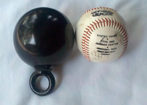 A new and unique way to work your fingers and test your grip strength. 3 inch hollow steel ball with a tough powder coated finish. Smooth surface, nothing to grip...really tests finger strength. Use a carabiner to attach the Thunder Ball to a pulley machine. Or use a carabiner and chain to attach the Thunder Ball to a weight plate. Carabiner, chain, weight plate and baseball NOT included