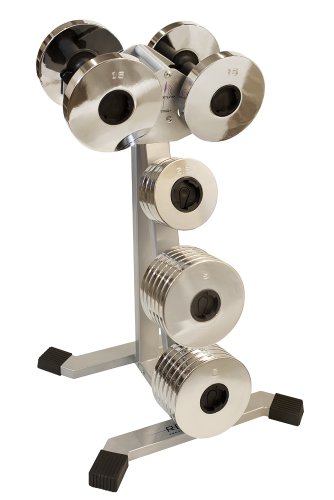 This lightweight, compact stand has a platinum finish and only weighs 18 pounds. Now you have an efficient and convenient storage for your dumbbells and the quick-change weights. The stand comes with hardware to store the curl bar on he back of the stand