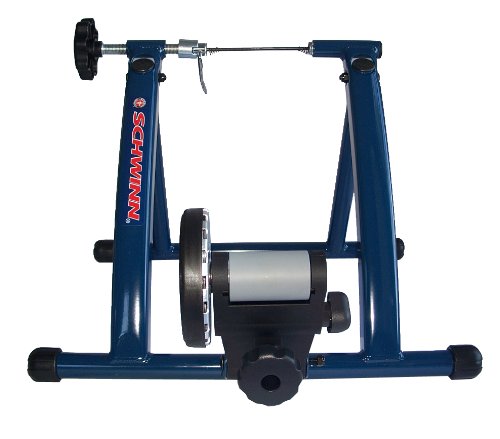 The Schwinn Magnetic Bike Trainer is a key component to any rider's off-season bike riding. While it's more enjoyable to get outdoors for a ride, this trainer helps you stay in shape even when the weather turns and the days get shorter and darker. With five different levels of resistance, you'll be well trained and prepared for any kind of ride. This trainer features a broad, heavy-duty frame style that insures a comfortable, secure fit for your bike. The magnetic resistance provides a remarkably smooth ride to help mimic being out on the road while producing very little noise. From the beginner to the advanced cyclist, this trainer will have you riding in no time, making that bike in your garage a new piece of indoor exercise equipment. The frame features an easy fold-down design for traveling. The trainer is very easy to assemble and it includes an extra skewer for your bike. This Schwinn Magnetic Bike Trainer offers five levels of resistance for training and also folds for easy storage.