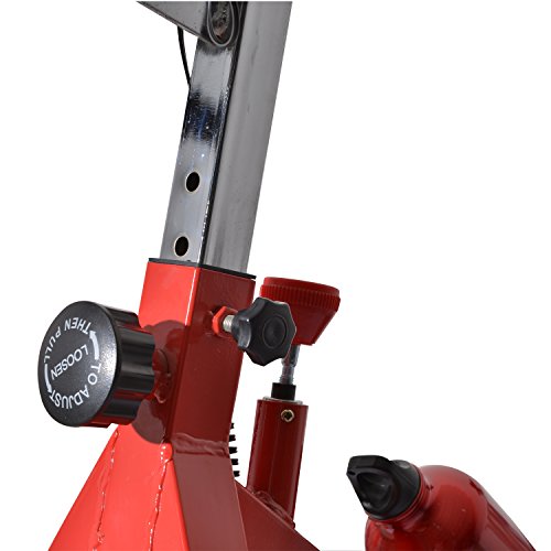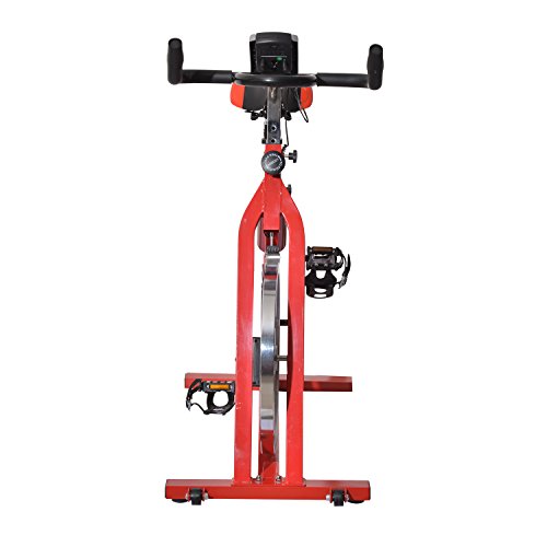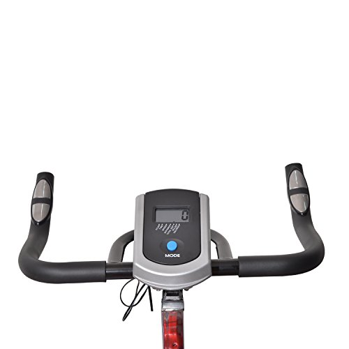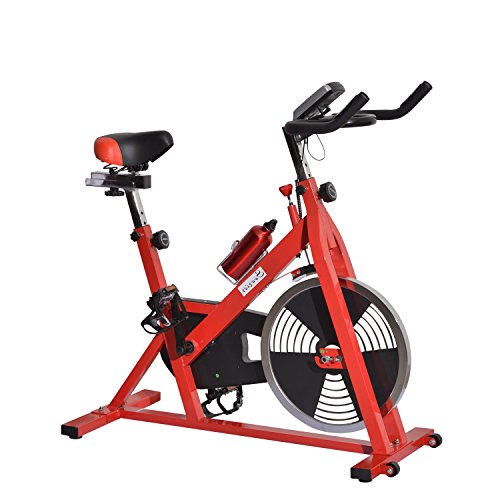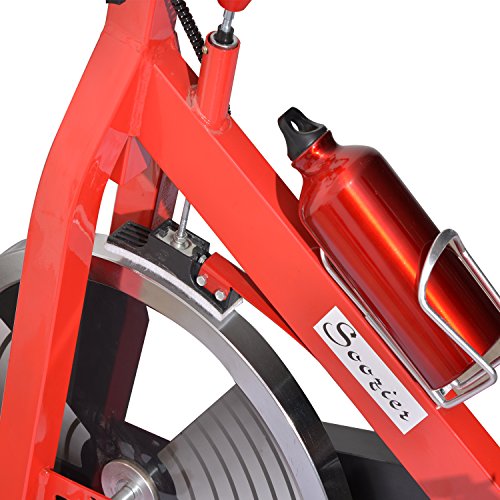 Improve your cardiovascular health, burn fat and increase leg strength in the comfort of your home with this Soozier indoor spin bike. This bike has a sturdy steel frame for extra durability and a chain drive allows for smooth pedaling. The smooth chain and flywheel give you all of the functions of a normal exercise bike but with a much quieter sound. Use this at home or in a gym and you will feel the burn in minutes. The adjustable seat, handlebars and resistance make this a great fit for a wide variety of body types. Track your distance, calories burned, time, speed and pulse with the easy to read LCD display panel. Give yourself the body you have always wanted by putting in the time on your new Soozier spin bike. Features: - Upright cycling that you can use in the comfort of your own home - Sturdy steel frame gives extra stability - 28lbs mute flywheel for quiet spinning - Adjustable seat, handlebars and resistance - Small transporting wheels allow for easy portability - Improve cardio, burn fat and gain strength - LCD display shows distance, calories burned, time, speed and pulse - Accessories include a water bottle and an instruction book - Simple assembly required, all necessary parts included Specifications: - Color: Red and Black - Overall: 41 1/4"L x 19"W x 44"H - Seat height: 39 1/2" - Handle height: 37" - Maximum user weight: 265lbs
