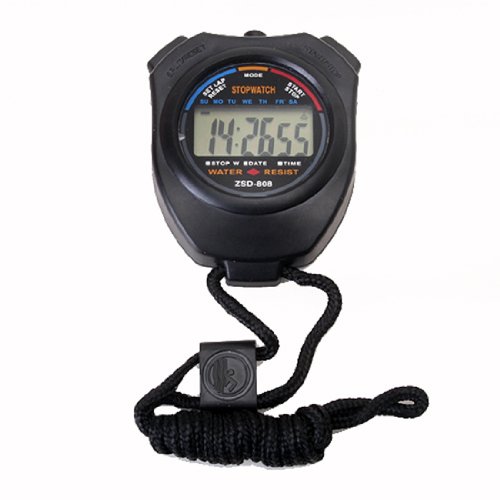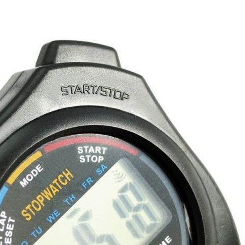 Features: * Display hour, minute, second, AM/PM, month * Display double count timer * Display time calendar week and alarm time. * Can select 12 or 24 hour user * 1/100 second Chronograph up to 23 hours, 59 minutes, 59 seconds * Timer stopwatches alarm with 4 minutes snooze * Powered by one AG13 button cell (Included) * Hourly chime * Size: (78*63*17)mm (max) * Color: Black Package included: 1 x Stopwatch