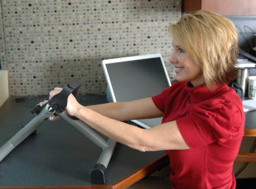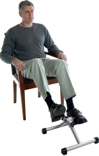 - Portable folding exercise bike that sits on a tabletop or on the floor