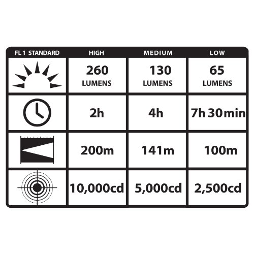 - Run time: high: Up to 2 continuous hours, medium: Up to 4 continuous hours, low: Up to 7.5 continuous hours, strobe: Up to 5.5 continuous hours