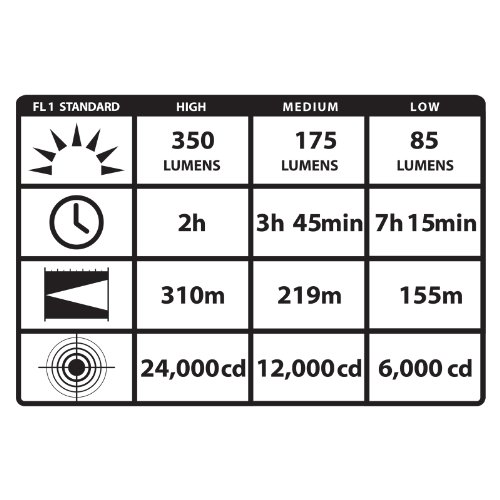 - Runtime: High beam: up to 1.75 continuous hours; Medium beam: up to 3.5 continuous hours; Low beam or strobe: Up to 6.75 continuous hours