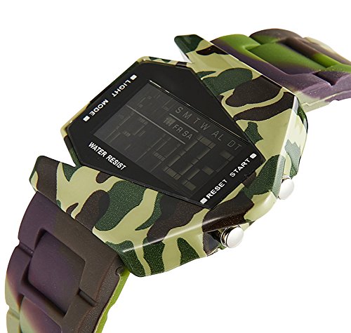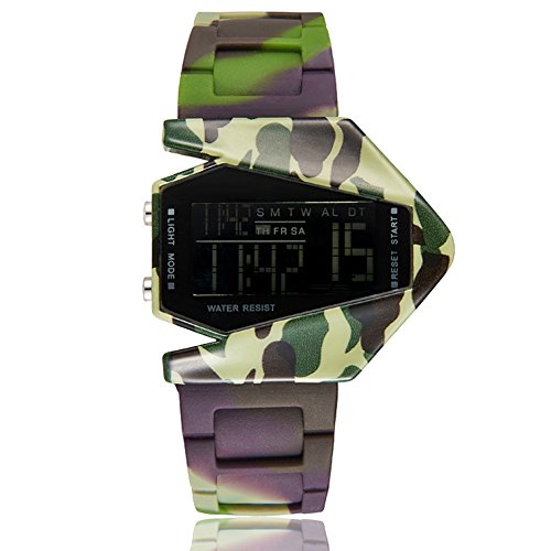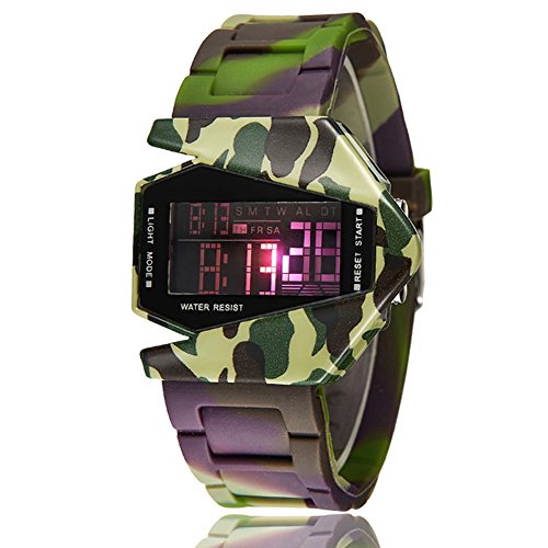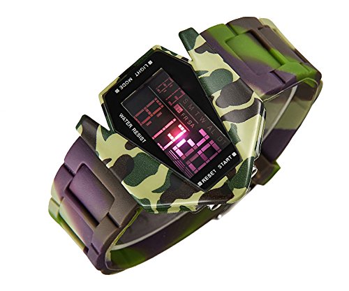 Camouflage silicone band with vivid colorful light digital numbering. Unique, futuristic, air-planed shaped face. Trendy yet classy! Special features include: Bright LED easy to read. Colorful display, lights up in different colors Unique shape and stylish design. Stealth fighter style makes it special and personalization Solid stainless steel back cover. Water resistant. Soft silicone strap and very comfortable to wear Unique shape and stylish design Unique, futuristic, air-planed shaped face and Stealth fighter style make you are so cool and personalized around the world. Cool colorful lights display The lights are pretty cool, it can light up in different colors. It can be red, blue, green or it can flash with all colors. Multifunctional with alarm Come with date and week display; alarm, lights, 12/24 hr setting and stop watch.