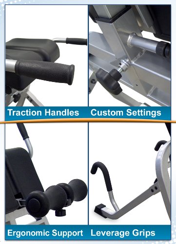 - Traction handles for stretching lower back; lower handles for user-controlled rotation