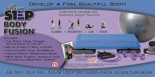 The Step Body Fusion. Get your body back in shape! It's easy to get in a workout rut. But it's time to break out of that funk and start feeling better... the Step Body Fusion is your solution! Using the Body Fusion workout DVD featuring aerobic instructor Cathe Friedrich, you'll shape and tone muscles for that beach body you've always wanted! The Step is a super-durable, non-slip surface for grooving your body back to life! Package includes: 65-cm stability ball with pump; Vinyl-coated, 3-lb. dumbbells; Medium weight resistance band; Step is adjustable from 4-6".; Order your Step home trainer for a new, healthier YOU! Act Now! The Step Body Fusion