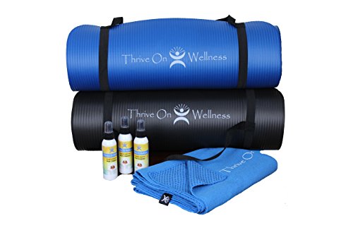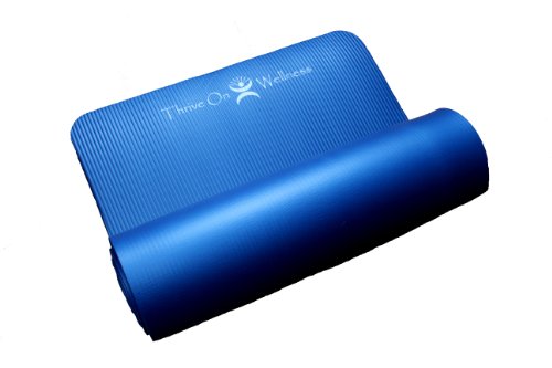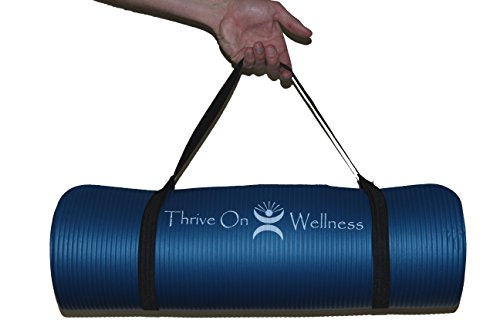 Increase Wellness -- Invest in a Comfortable Mat! Enjoy the Thrive on Wellness Yoga Mat BENEFITS: - Experience ample space to move and increased comfort compared to a standard yoga mat - Practice your favorite exercise routine with a single mat instead of the hassle of two stacked mats - Great for people with joint or back concerns and worry about feeling comfortable on the floor - Excellent for Pilates, floor exercises and stretches -- Best for Restorative Yoga. We recommend purchasing a Thrive On Wellness Yoga Towel to lie on top of this thick mat for Hot Yoga or High Instensity Workouts to absorb extra sweat - Use the Thrive On Wellness Logo for extra focus and concentration, or as a helpful mantra or affirmation - There are plenty of other uses for this mat including sleeping, kneeling and sitting for long periods in comfort Thrive On Wellness Exercise Mat FEATURES: - 72" X 24" X 1/2" (183cm x 61cm x 1.3cm) - thick, extra-long and wide - rolls to about 7" diameter - Easy on/off elastic strap for hassle free storage and travel - Non-toxic, easy to clean, moisture resistant, high density NBR foam and anti-slip - Extra support for your spine and gentle on your joints - Great for all ages and body types - Best experienced in bare feet, socks or Yoga socks, avoid sharp objects, animals or shoes Your purchase is completely RISK FREE. As a 5 STAR seller, we work hard to ensure you are fully satisfied. Your purchase is also backed by Amazon A-Z Guarantee and return policy. No worries, Thrive On! So order NOW, while supplies last AND when you DO, consider getting TWO... one for you and one for your very BEST friend -- CLICK the ADD TO CART BUTTON Above and enjoy!