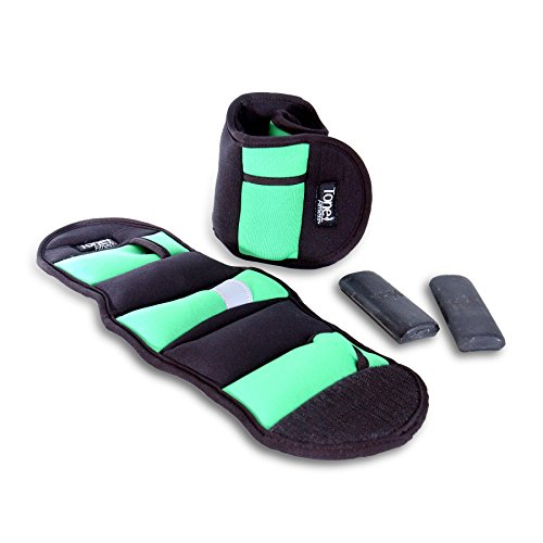 The Tone Fitness Adjustable 5 lb Ankle Weights can be used to add resistance for a variety of lower body workouts such as walking, toning and stretching exercises. The added weight helps tone your thighs and calves. Made of soft, stretchy neoprene fabric that are breathable and comfortable to wear. Simple velcro closures provide a secure, snug fit for all ankle sizes. Unique pocket design allows for quick and easy weight adjustments.