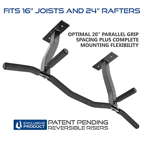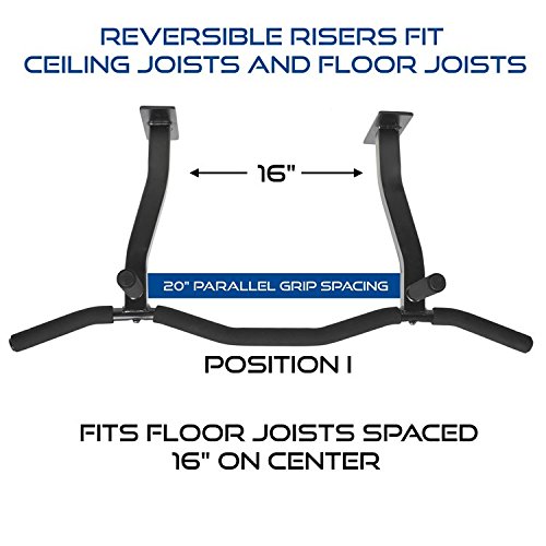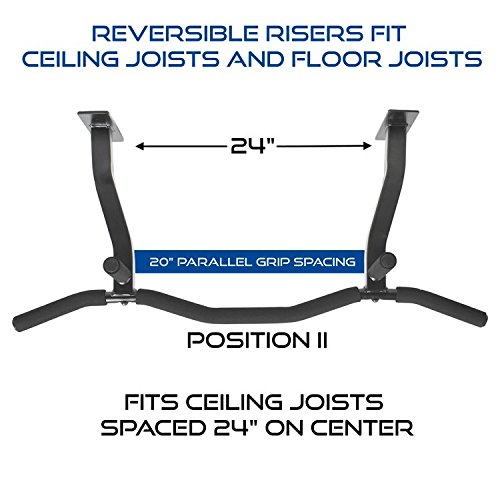 The new Ceiling Pull Up Bar by Ultimate Body Press fits 16" and 24" joists and is ergonomically designed to reduce strain and increase gains during your workouts. Featuring ideal 20" spacing on the parallel grips and angled bars for a more natural grip position, the Ceiling Mount Bar supports your best fitness everyday. Bolted to the structure of your home, the Ceiling Mount Pull Up offers confidence inspiring stability and a solid anchor for accessories. This Ceiling Pull Up Bar features our latest innovation - Dual Position Risers. Whether you are installing below floor joists spaced 16" on-center or ceiling joists with 24" on-center spacing, the reversible Dual Position Risers adjust to fit your application without taking up valuable floor space in your home. The Ceiling Pull Up Bar by Ultimate Body Press features a state of the art combination of grip angles previously only available on commercial gym equipment. By providing a more natural hand position during chin ups, parallel grip and wide grip pull ups the finely tuned angled grips help you avoid over articulation of the shoulders and reduce strain on your wrists and elbows. Comfortably spaced at 20" the parallel grips are a great fit for just about every build. The bars drop 14" from your ceiling providing plenty of head room and a full range of motion. Order your ceiling bar with the confidence of knowing it fits your gym placement now and in the future.