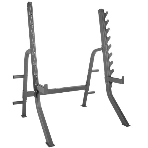 The XMark 11-Gauge Adjustable Squat Rack with Olympic Plate Storage XM-7480 will meet all of your workout needs aiding you as you perform squats, bench presses, dead lifts, rows, etc. with an Olympic 7 foot bar. Features include a 9-position chrome gun rack, 2 safety spotter hooks and 400 lb. maximum load capacity. Features: - Heavy duty 11-gauge 2” x 3” steel mainframe construction - Gun rack supports 400 lbs - 2 adjustable safety spotter hooks - For use with a standard or Olympic 7-foot bar - Olympic plate weight storage