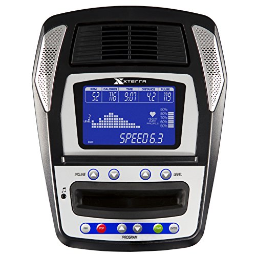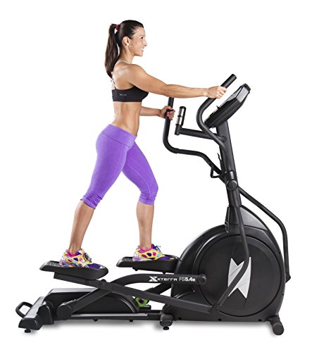 Discover XTERRA and see why "it's not just a sport, it's an adventure" with this state-of-the-art elliptical trainer. It's all about comfort for triathlon competitors and that's where the XTERRA FS5.4e elliptical offers a large 18" stride, power adjustable elevation, and only quality components that are found in health club ellipticals. Features Non-impact total body workout features synchronized upper and lower body movement Ergonomic 18" stride length provides a smooth, comfortable elliptical motion forward and reverse 21 lb heavy duty steel flywheel offers premium fluid motion Sealed commercial bearings and premium bushings in all pivot points ensure superior smoothness and durability Power Adjustable Elevation for workout variety 2 concave, high durometer wheels ride effortlessly on dual aluminum rails for premium motion and durability Large 6.5" Blue Backlit LCD electronics are large and easy to read - keep you updated on all the necessary information (time, speed, calories, program, rpm, level, distance, watts and pulse) 7 pre-set, 2 user customized programs, 2 heart rate programs and a manual program Audio jack and speakers for MP3 player built into the console Cooling fan Hand grip pulse sensors (monitor your heart rate) are conveniently mounted on the handlebars to keep your workouts safe and effective 20 levels of resistance provide a variety of exercise options for all fitness levels Magnetic resistance system is friction-free for smooth, quiet, and maintenance-free operation Extra-large, self-leveling cushioned pedals Front transport wheels for moving your equipment Water bottle holder and bottle included 110v plug-in required Weight limit: 325 lbs Assembled dimensions - LWH: 68.9" x 22.4" x 62" Assembled weight: 169.8 lbs Warranty: Lifetime frame and brake 3 years parts 1 year in-home labor.