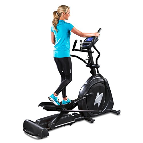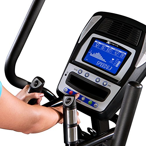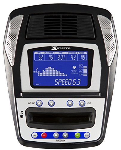 Prepare yourself like a professional XTERRA Triathlete who hops across rocks, soars across streams and zig-zags their way along a mountain trail. Proper training is the key, and if indoor training is in your plans, then the XTERRA FS5.6e help you reach your health and fitness goals. Features Ergonomic 20" stride length provides a smooth, comfortable elliptical motion forward and reverse 2" Q Factor (distance between user's feet) allowing for a better biomechanically correct stride 21 lb heavy duty steel flywheel offers premium, fluid motion 20 electronic incline levels for workout variety Concave, high durometer wheels ride effortlessly on aluminum rails for premium motion, stability and durability Extra-large 6.5" bright blue backlit LCD electronics are large and easy to read - keep you updated on all the necessary information (time, speed, calories, program, rpm, level, distance, watts and pulse) 7 pre-set, 2 user customized programs, 2 heart rate programs and a manual program Built in heart rate receiver compatible with a Telemetric chest strap, not included Audio jack and speakers for MP3 player built into the console (MP3 player not included) Swivel fan to keep you cool Remote resistance controls on handlebars 20 levels of resistance provide a variety of exercise options for all fitness levels Magnetic resistance system is friction-free for smooth, quiet, and maintenance-free operation Can be used in forward or reverse direction to utilize multiple muscle groups Extra large pedals Integrated 2 degree inward pedal tilt for comfort Front transport wheels for moving your equipment Heavy-duty steel frame Water bottle holder and bottle included 110v plug-in required Weight limit: 375 lbs Assembled dimensions - LWH: 82.3" x 21.7" x 67.3" Assembled weight: 178.6 lbs Warranty: Lifetime frame and brake 5 years parts 1 year in-home labor.